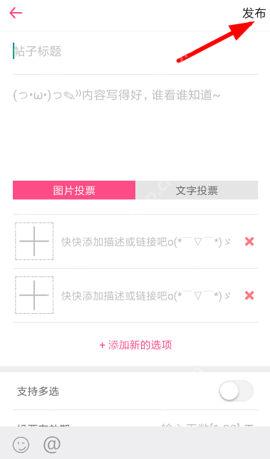 3、根据不同的需求,你可以选择设置“图片投票”或“文字投票”,添加投票的描述或链接后,点击右上角的发布按钮即可完成。