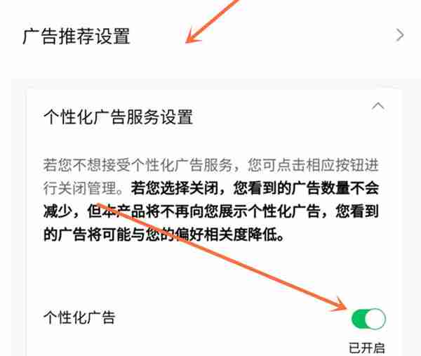 在“广告推荐设置”页面,您会看到“个性化广告”选项。 点击右侧的开关按钮将其关闭即可。