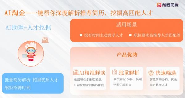 而聚焦 HR 主动寻才需求的 "AI 淘金 ",则在推荐算法上完成迭代升级,创新引入 " 简历推荐分级 " 体系,对推荐简历的甄别更精准,较以往显著降低人工判断成本,据统计可节约 40% 的简历筛选时间,推动企业招聘质量与效率新提升。
