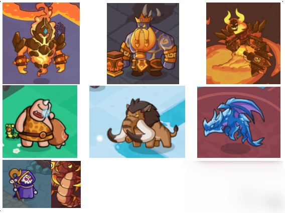 分别是矮人王、食人魔、冰霜巨龙、猛犸巨象、骷髅法师、熔岩领主、熔岩巨虫、炎魔大帝。