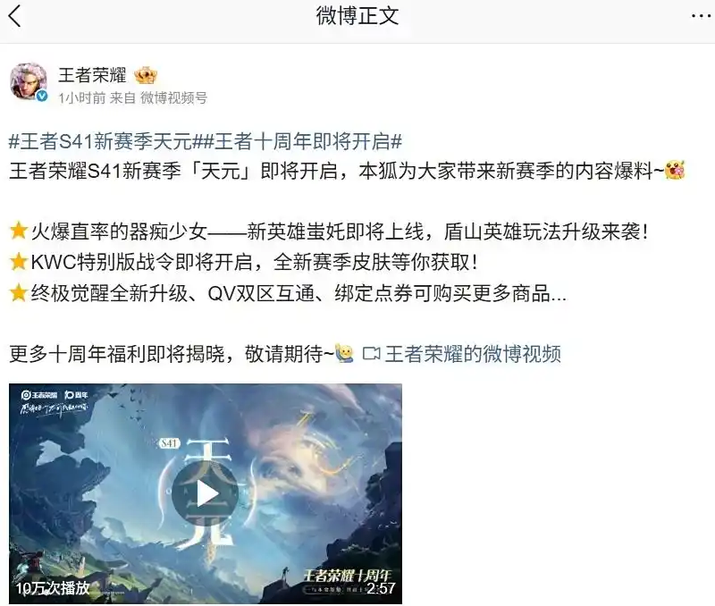 腾讯《王者荣耀》官方微博近日宣布,十周年 S41 新赛季「天元」版本即将开启(新版本具体上线时间未公布)。