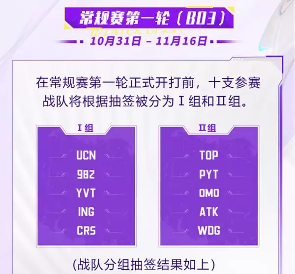本赛季的赛程被分为常规赛第一轮、常规赛第二轮、卡位赛以及季后赛四个部分。常规赛第一轮,十支战队将在开赛前根据抽签被分为一组与二组,每组共五支战队,两组分别进行组内单循环BO3对决,胜者积一分,败者不积分,最终每组积分排名前二的队伍将被分到A组,而其余队伍将被分到B组。