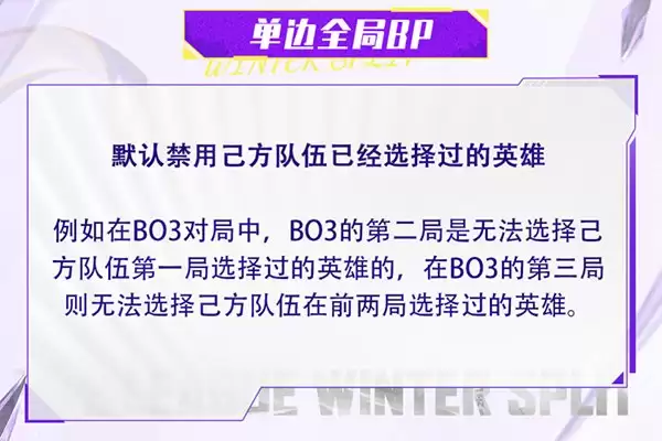 本届赛事全程采用单边全局BP赛制,这是默认禁用己方队伍已经选择过的英雄的比赛模式。例如在BO3对局中,BO3的第二场是无法选择己方队伍第一场选择过的英雄的,在BO3的第三场则无法选择己方队伍在前两场选择过的英雄。