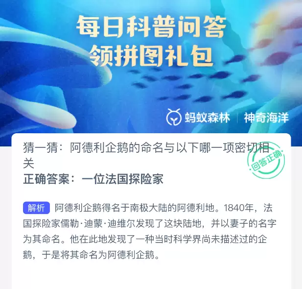 今天的神奇海洋科普问答又和大家见面了!2025年11月11日的题目已经揭晓:阿德利企鹅的命名与以下哪一项密切相关?正确答案现已公布,点击即可参与拼图活动,让我们一起为修复海洋生态贡献力量!