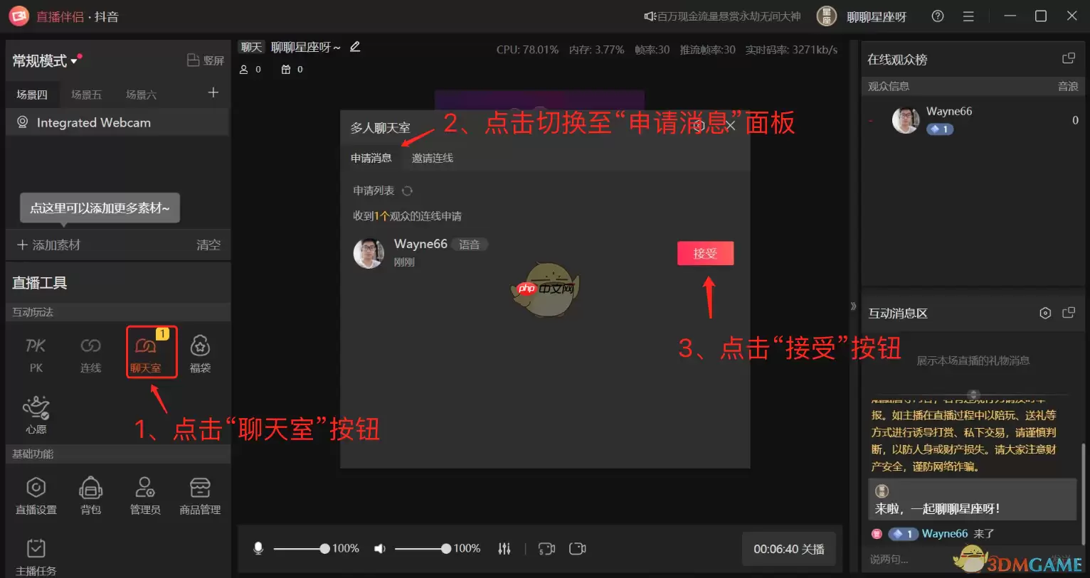 首先,点击直播界面中的“互动玩法”区域,找到并点击“聊天室”按钮。这个操作会打开多人聊天室窗口,让您能够管理所有互动请求。