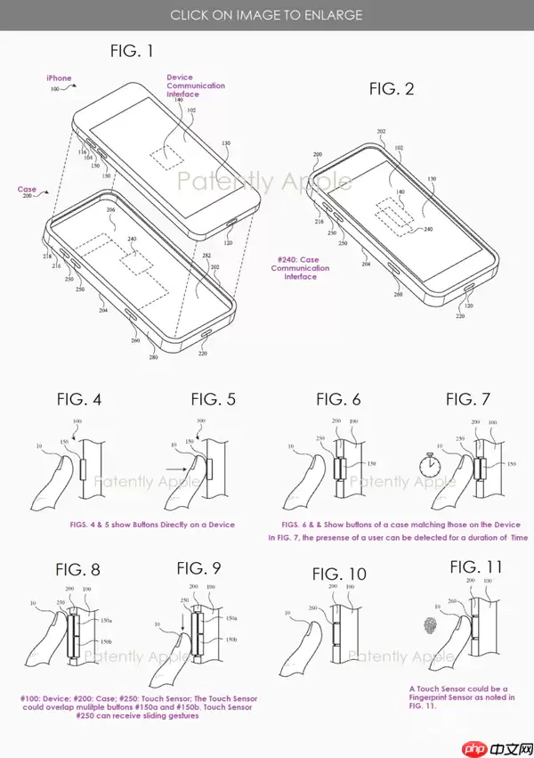 此外,由于目前部分实体拍照按键采用下凹设计,简单地开孔或者给手机壳加上一颗传动按键,都会对操作的精准度产生影响,还有可能产生误触,甚至导致某些功能无法正常使用。为此,苹果甚至申请了一系列手机壳相关的专利来解决这个操作问题。其手机壳集成了相机控制按键,当安装到支持相机控制的iPhone上时,系统将通过手机壳上的按键获取输入信号,无论是轻压重按,还是触摸滑动,都能识别响应。