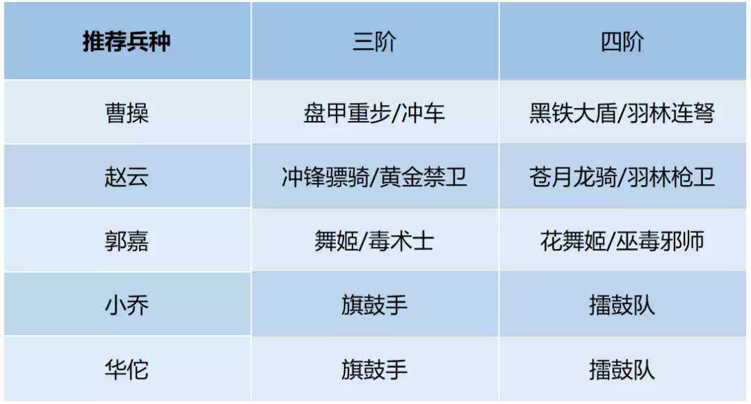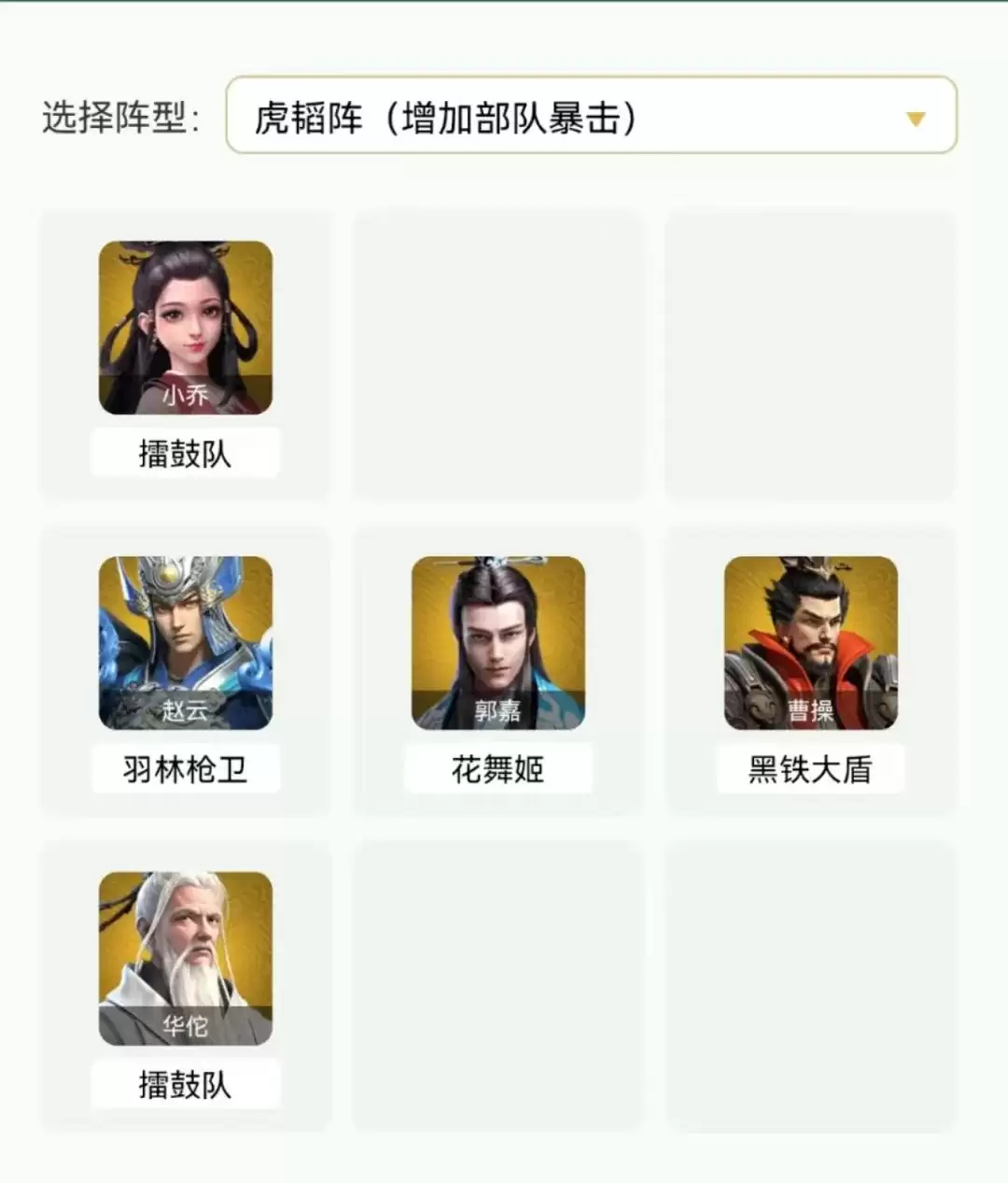 赵云、小乔、华佗、郭嘉为连续释放技能武将,在pve中曹操抗住敌方普攻最高的位置,小乔为鼓手在前方抗住一波输出第二回合连续释放技能,郭嘉用舞女兵种连续控制,华佗为鼓手在后方形成补给链,赵云则在中间吃到曹操、小乔的BUFF形成连续输出。