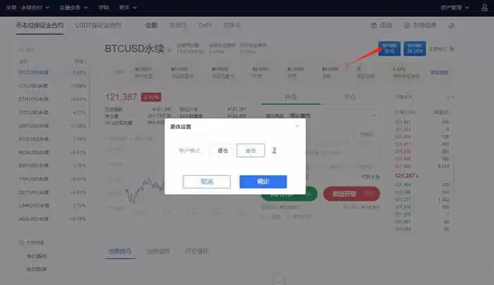 1. 点击页面右上角账户模式按钮,可以选择逐仓或全仓,全仓是开仓后账户所有资产作为仓位保证金,逐仓是只有该仓位占用的部分作为仓位保证金。