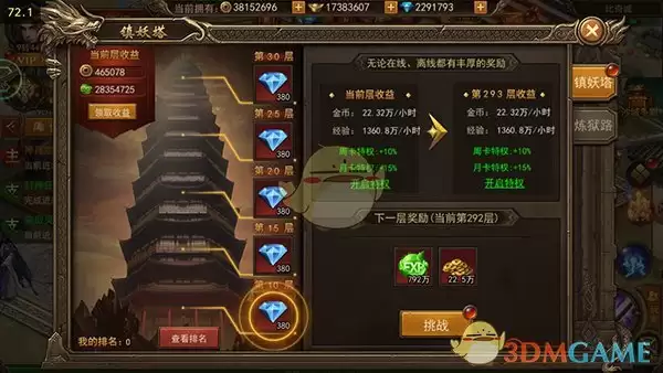 通关“练功房”可获得巨额经验,通关层数越多,经验奖励越丰厚,同时还能显著提升挂机收益。每一关都蕴含上千万经验,务必尽力挑战更高层数。
