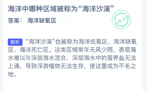2025年12月26日,《支付宝》旗下的神奇海洋科普栏目公布了当日问题的答案。当天的挑战题目正是“海洋中哪种区域被称为‘海洋沙漠’”,而官方给出的正确答案是【海洋缺氧区】。