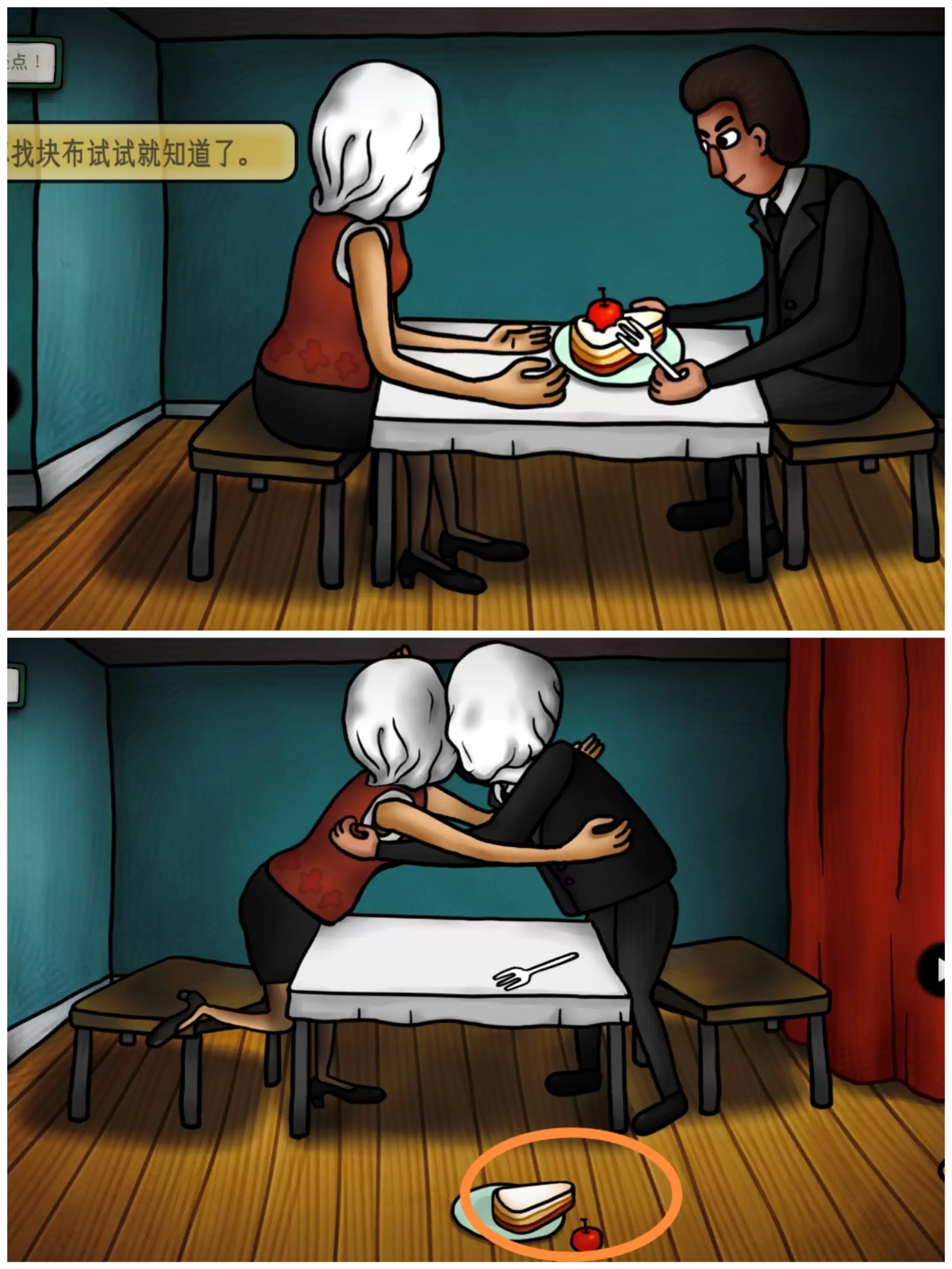 回到刚才的男女场景里,点击男女对话提示需要找来一块布,将白布盖在男人的头上,桌子上的蛋糕掉在地上,捡起蛋糕上掉下来的樱桃。