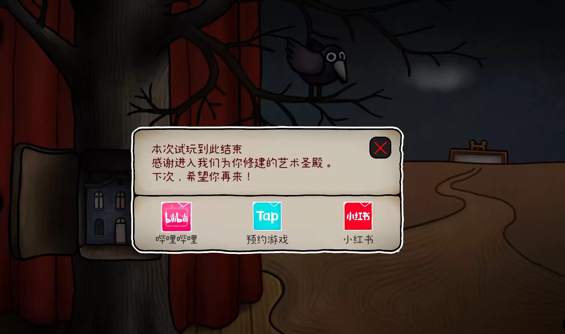 用钥匙打开大树的树洞,里面是一个新的别墅场景,但是点击会显示试玩版已结束。