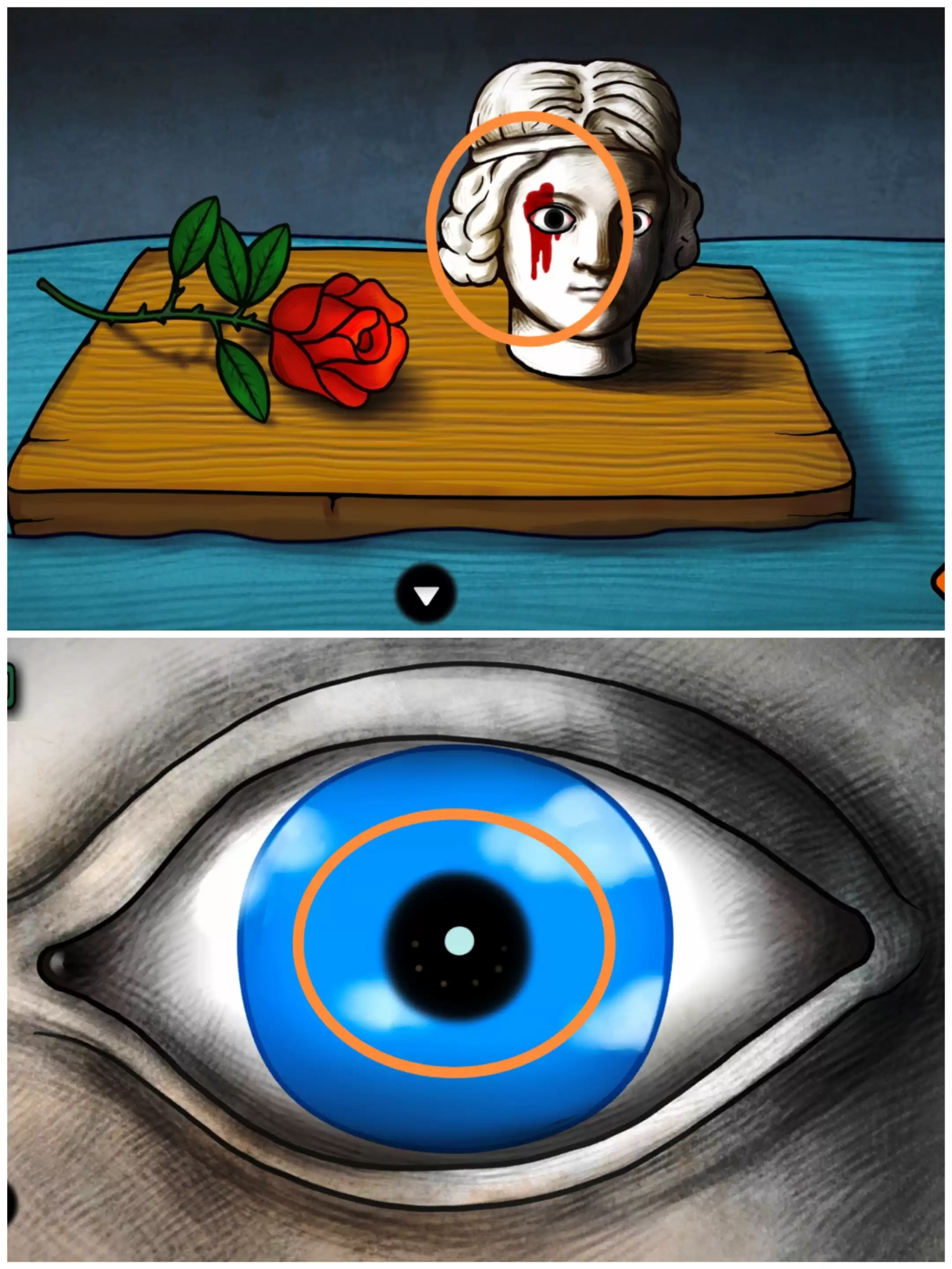 点击画布后的木板,用玫瑰花点击带血的雕像(有点小高能),雕像睁开了眼睛,点击左眼点击黑色的瞳孔(这里的解密答案在下一段)