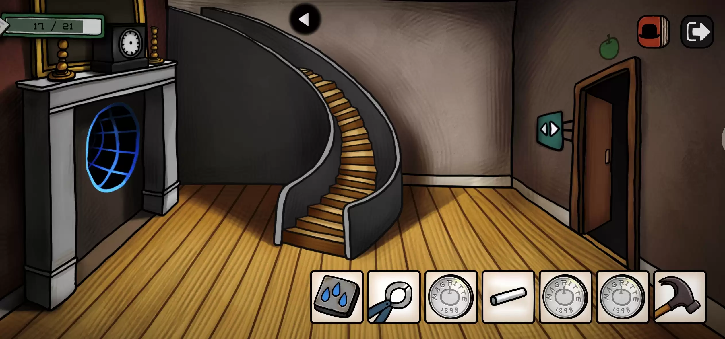 来到一楼大厅点击左边壁橱上的闹钟,将指针放上会出现一个时空隧道,从下面开来一辆火车,捡起掉在地上的钳子。