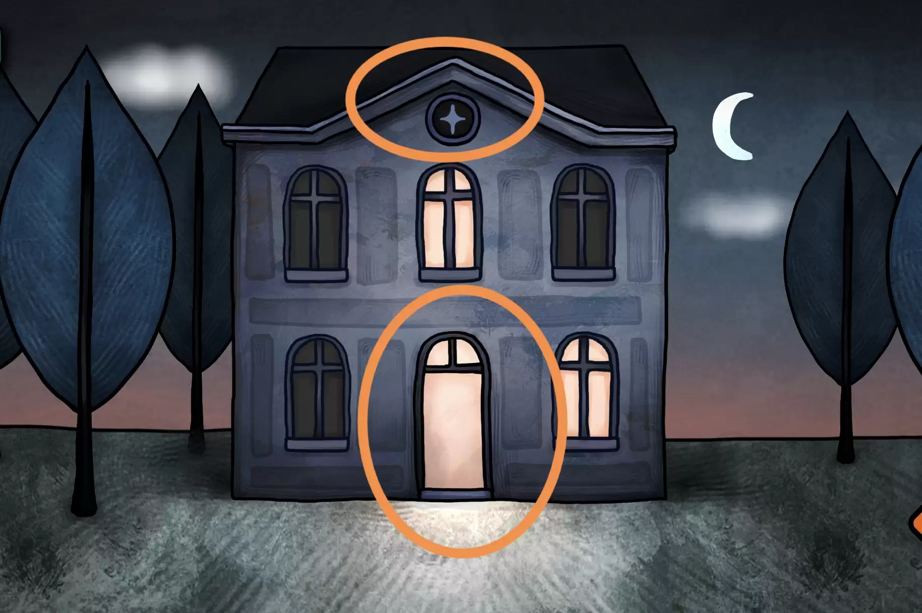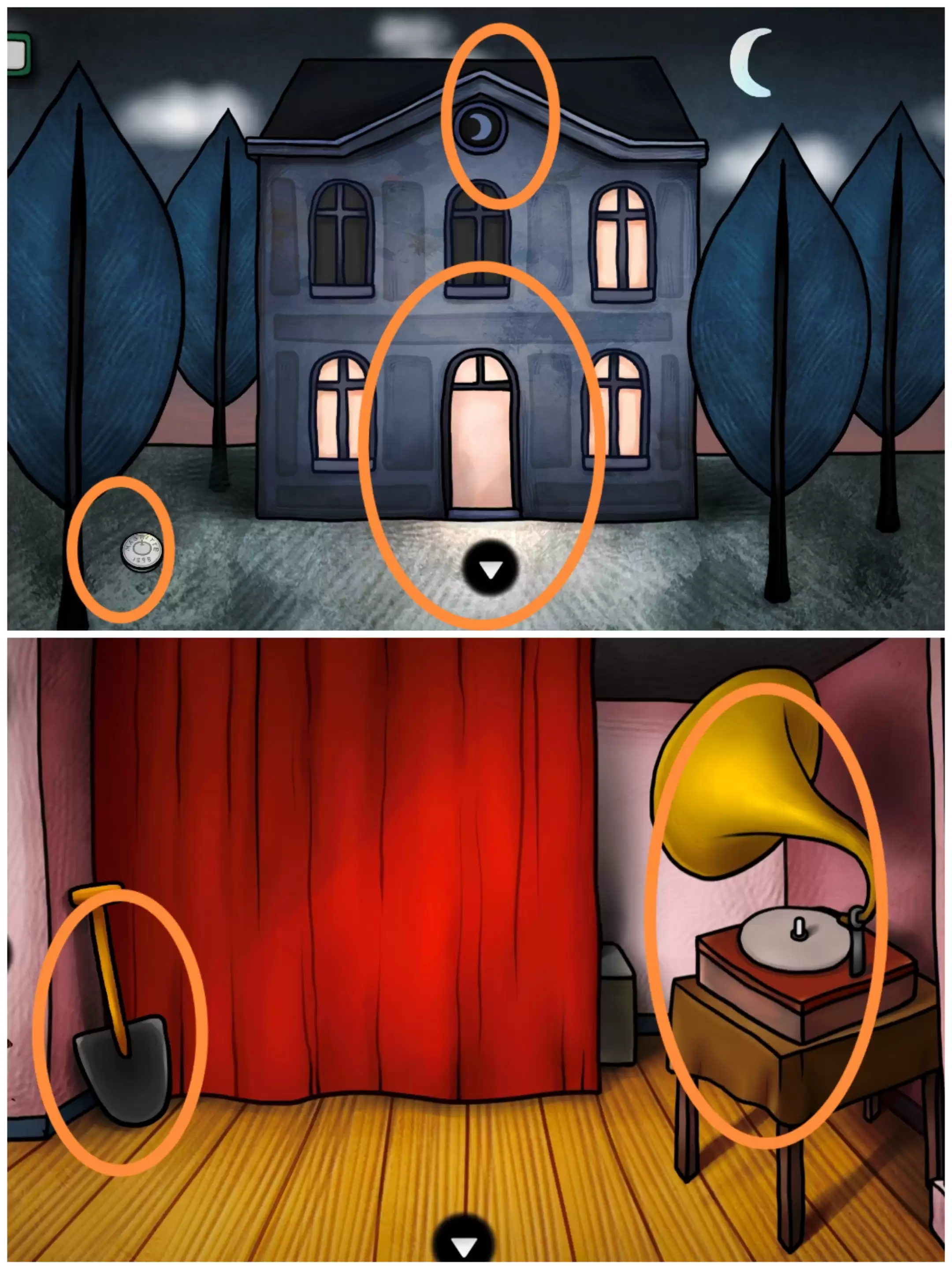 来到带面具的男人场景,将帽子给他,拿到硬币,出现新场景(一栋带有月亮徽记的别墅)。