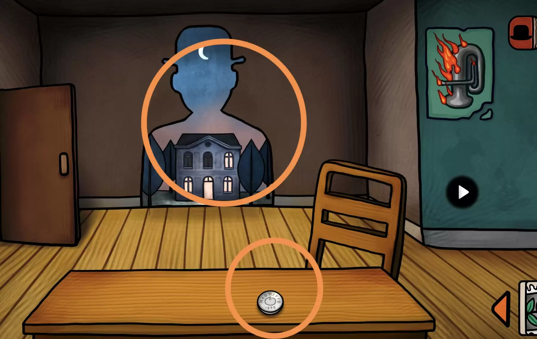 根据墙上挂着萨克斯被烧毁的图来到最右边的场景,点击右侧的画进入新场景,用火柴点击萨克斯,火将画布点燃露出画布后水上的木板,点击木板拿取上面的帽子和黑色邮票。