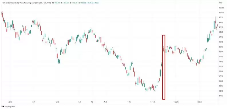 如波克夏曾于2022 年第三季13F 报告上,揭露买入台积电(TSMC),且因为波克夏是首次投资台湾公司,持有股数并高达6 千万股,占波克夏整个投资组合的1.39%,故台积电ADR 股价就在波克夏公布13F 后的隔日出现大涨7.6%。