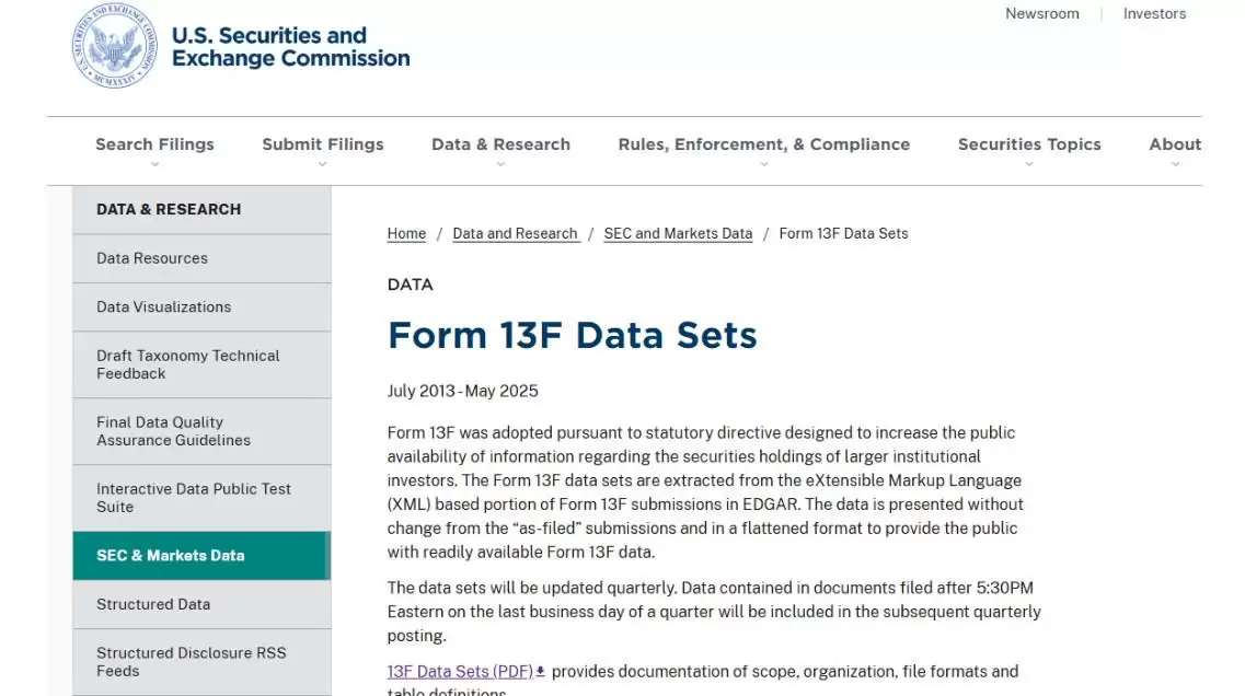 根据美国证券交易委员会(SEC) 规定,若资产管理规模超过1 亿美元的机构就必须在「每一季结束后的45 天内」,揭露所有管理的股权资产(如股票、ETF) 的多头部位,但不包含期货、固定收益等其他资产。