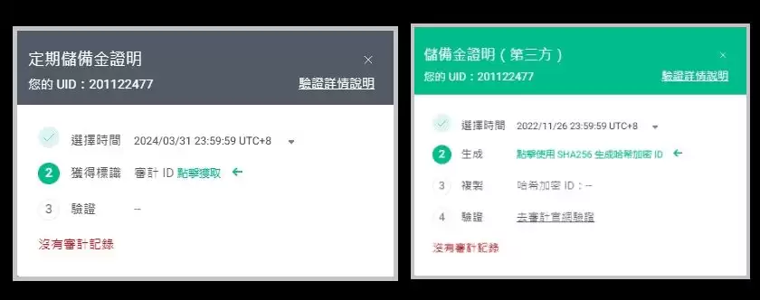我试着透过官网提供的路径进行验证,但收到了没有审计记录的提醒。可能因为我是在4月初入金,当下还未到4月快照更新的时间,所以我也就没有办法验证到账户资产。