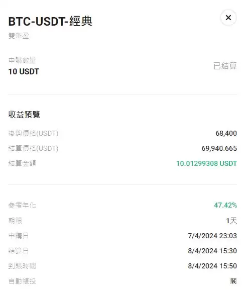 我有用10U 低买挂勾价68,400双币盈1天,预期年化率为47.42%,确实在隔日收到了10.01299308,等于1天就赚了0.1299308%,直接乘以365,一年就是47.42%。