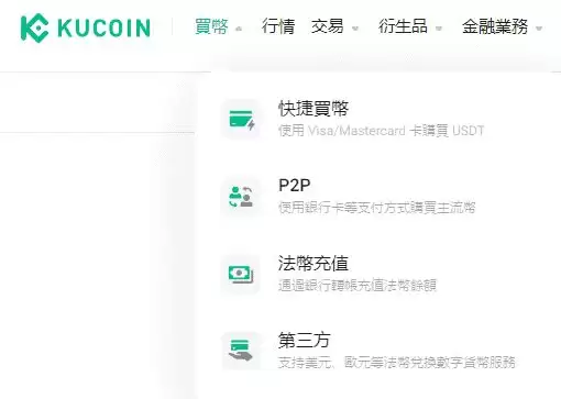 KuCoin提供了法币充值、信用卡刷卡、P2P、第三方平台入金的方式。但若想用台币入金,只能通过刷信用卡或第三方支付(Apple Pay),可是手续费真的超贵。