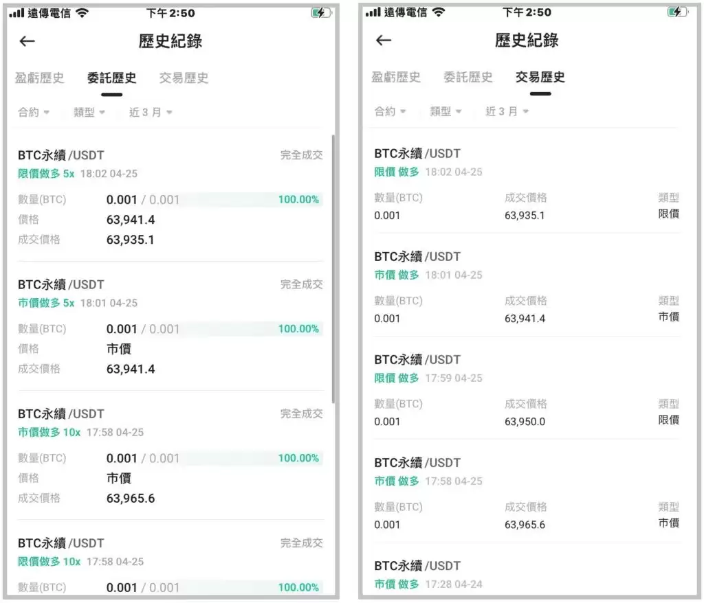 | BTC/USDT | 市价单 | 49.99 | 69675 | 69672.3 | <0.1USDT(0.1%) | 2.7 |