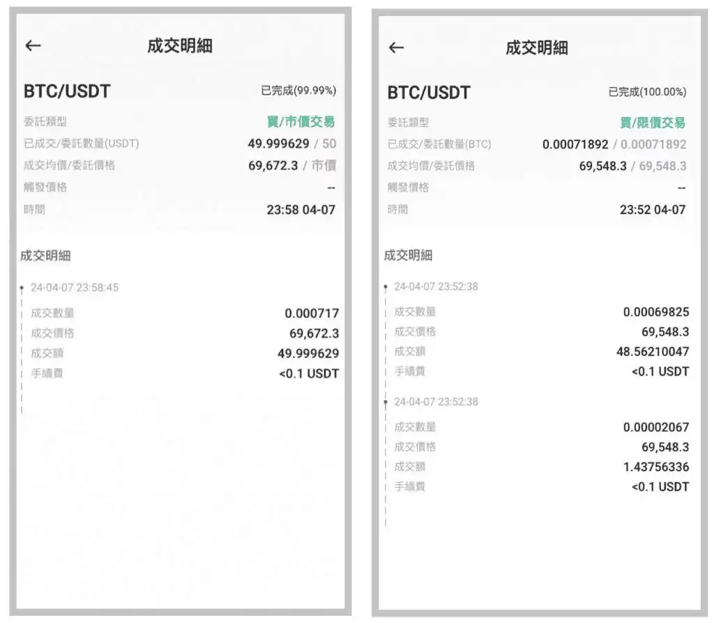 我以69,548.3 美元的限价方式买了了50美元的比特币现货,又以市价方式买了另外50 美元的BTC 现货,同时记录了实际下单时的手续费情况。