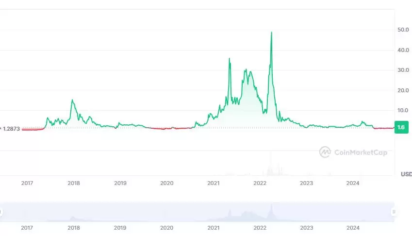 2019-2021年: 2020年11月起,该加密货币价格在0.50美元至4美元之间波动,随后在2021年5月初飙升至41美元,并在月底跌至12美元。在7月中旬加密货币市场整体低迷时期,该加密货币价格触底,并在9月9日回升至34美元左右,之后又跌至11美元左右。随后,该加密货币价格在10月中旬飙升至34.56美元。然而,从2021年末开始,加密货币市场再次开始下跌。
