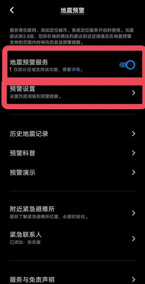 - 在安全设置页面内,寻找“地震预警”或“应急预警通知”相关入口,点击进入。