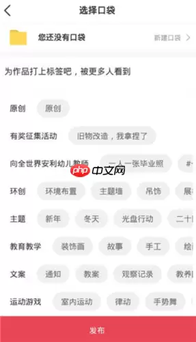 最后一步是为您的作品选择一个合适的“口袋”进行分类。“口袋”功能相当于个人或主题作品集,能有效管理您发布的所有内容。从列表中选择一个最贴切的“口袋”,再次检查标题、内容和图片,确认一切无误后,果断点击“发布”按钮。至此,您的作品就成功分享到幼师口袋社区了。
