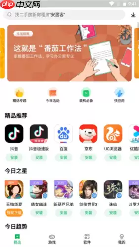 切换到“应用专区”,您可以集中浏览当下最受用户欢迎的各类实用工具APP。从办公学习到生活娱乐,海量应用帮助您提升效率、丰富生活。
