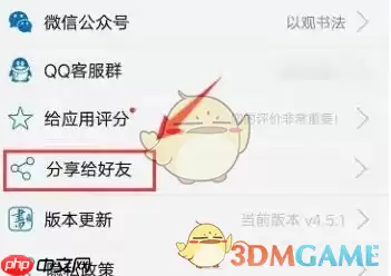 在“我的”页面中,各项功能会以列表形式呈现。此时,您可以向下轻轻滑动屏幕进行滚动浏览。在菜单列表中,仔细寻找并定位到【分享给好友】这个功能入口。该入口设计清晰,通常带有分享图标,方便用户识别。