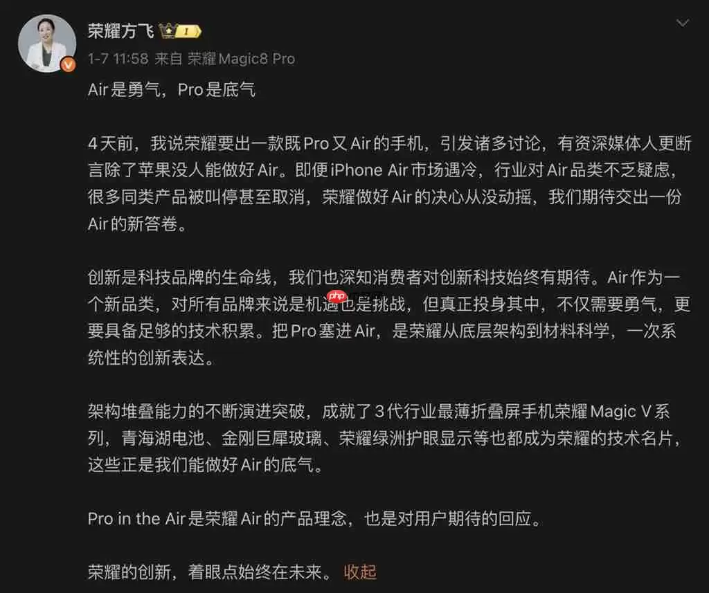 事实上,在此之前,HONOR产品线总裁方飞曾对外释放过相关信号。她在个人微博回应时表示,品牌已经成功打造了三代业界最薄折叠屏旗舰Magic V系列,如今“把Pro塞进Air”,是基于扎实的技术积累与十足的信心。这番表态,无疑为**HONOR Magic8 Pro Air**的“轻薄兼顾高性能”定位做了清晰背书。