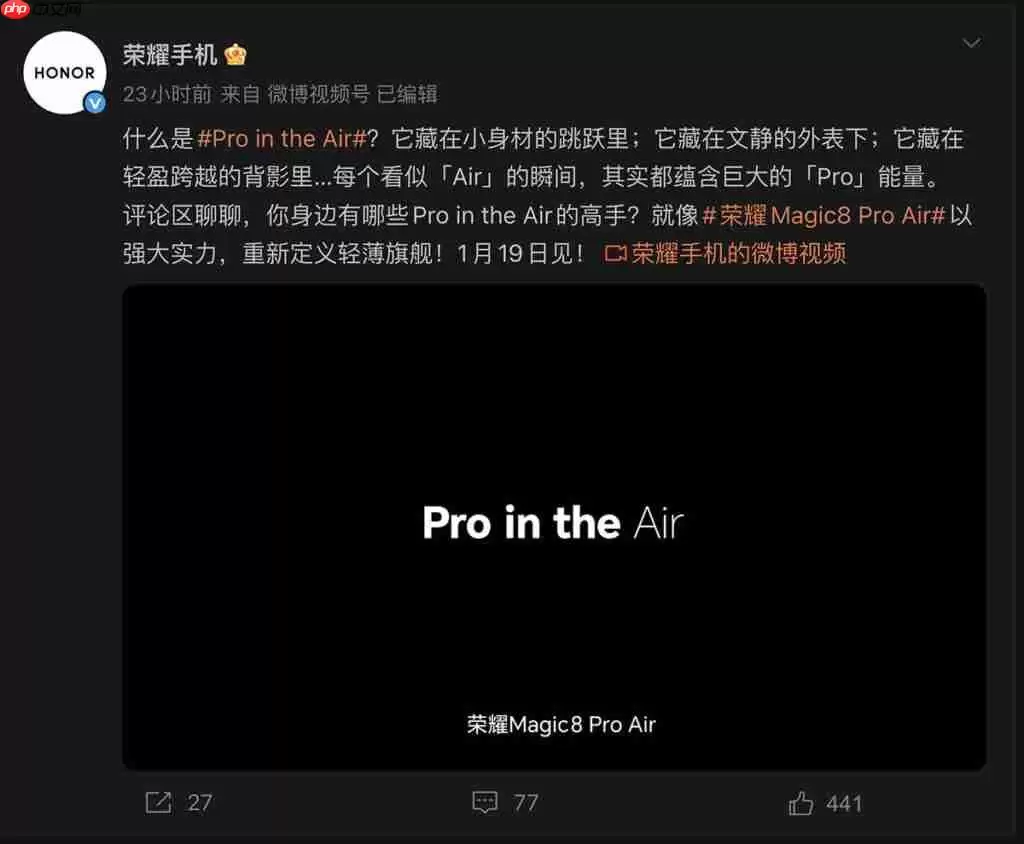 荣耀手机官方微博“荣耀手机”也发布了新品预告,明确表示将于1月19日召开新品发布会,正式带来全新的轻薄旗舰机型——HONOR Magic8 Pro Air。