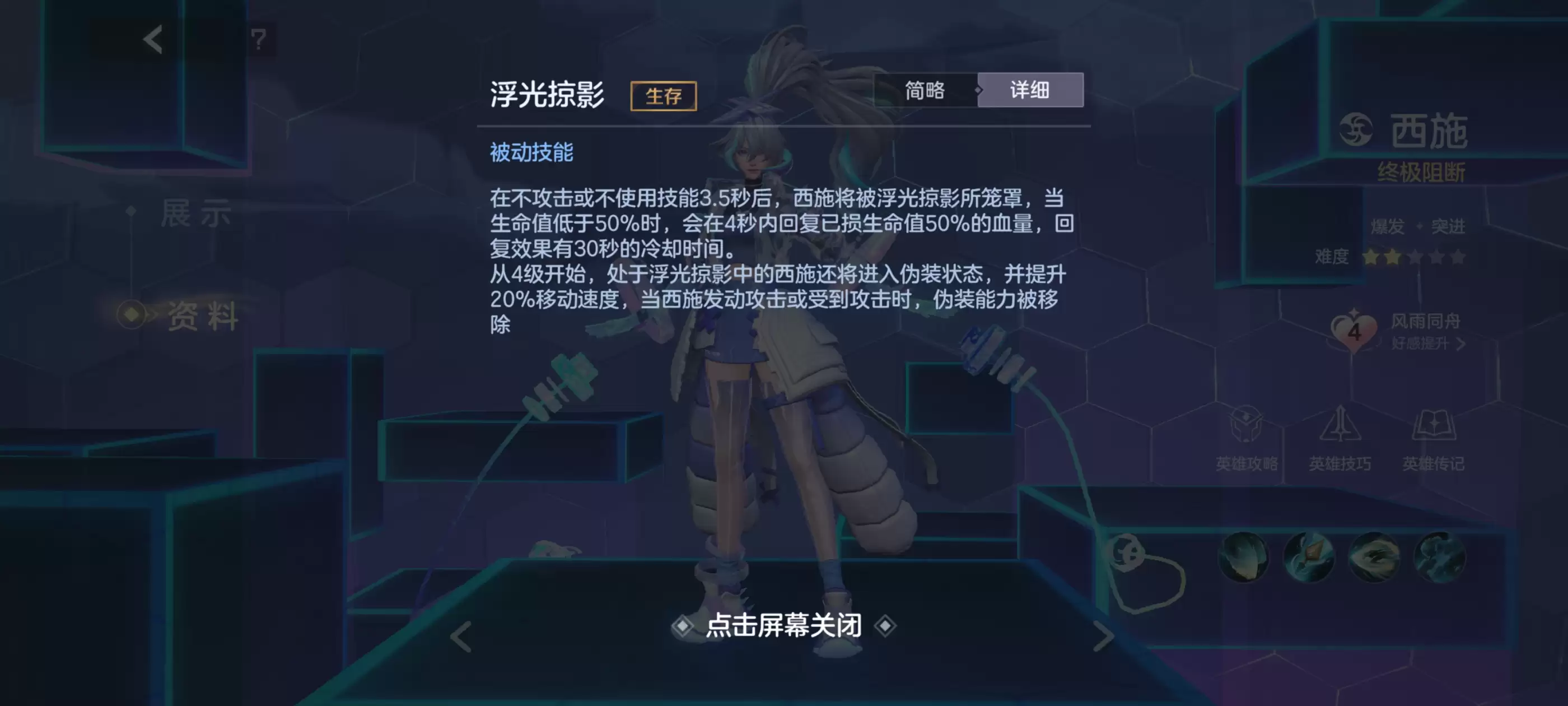 曙光英雄新版西施怎么玩,新版的被动相比于老版本残血隐身减伤,大大增加了西施的主动作战能力,在残血的情况下,可以通过被动恢复大量生命值,在到达4级后,被动还会赋予西施伪装能力,让西施的抓人更强。