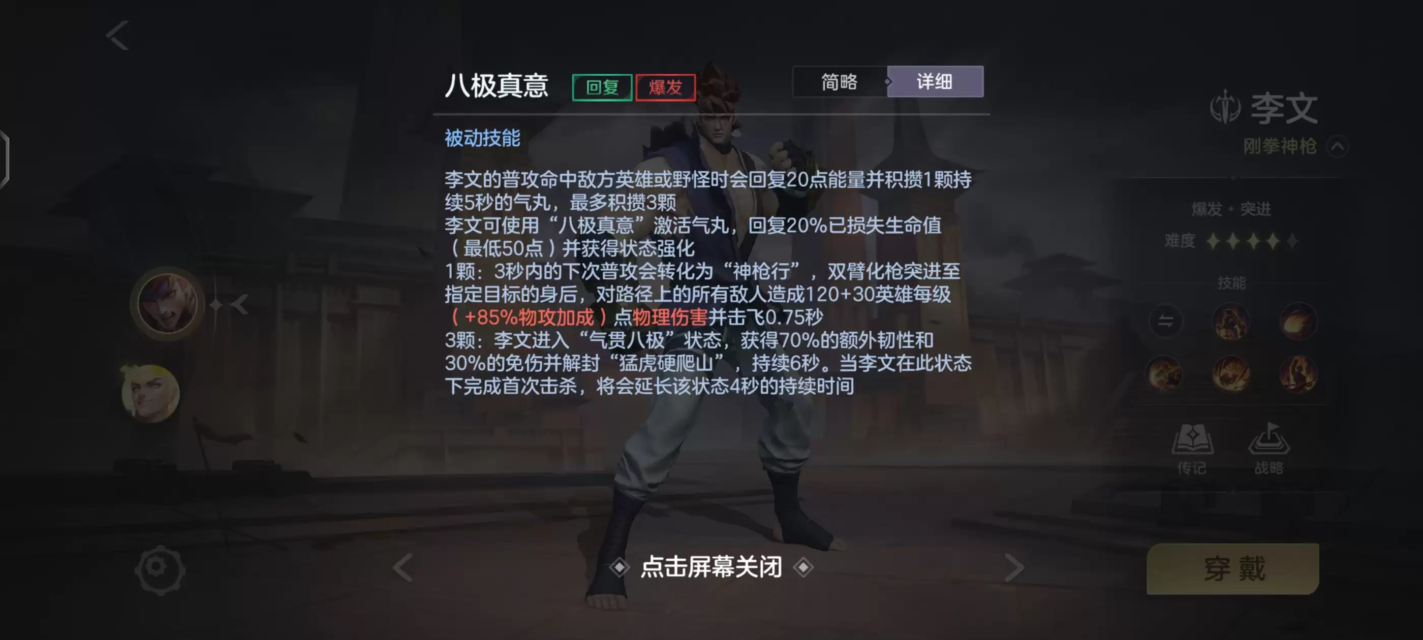 李文可以主动消耗1或3颗气丸以获得不同的加成,当消耗一颗时,恢复部分已损失生命值并且强化下一次普攻击飞路径上所有敌人,并且位移到目标身后,并且此次攻击必定命中被锁定的敌人,无论目标距离你多远都会追击过去。
