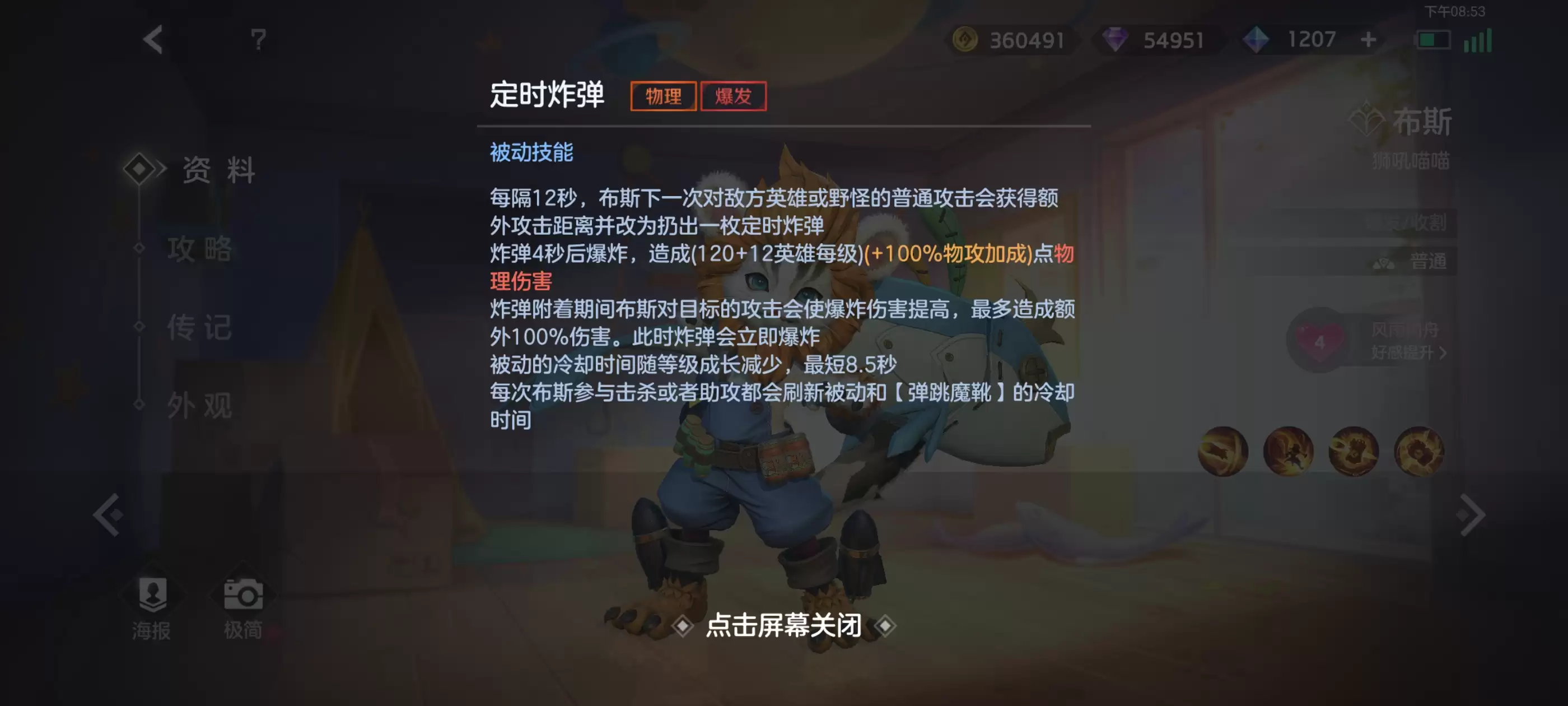 瞬爆雷:正常来说布斯的被动炸弹会在4秒后引爆,但是对目标造成伤害使炸弹额外伤害达到2倍时,可以提前引爆炸弹,引爆后将对目标最高造成2倍炸弹伤害【即2x(120+12英雄每级)(+100%物攻加成)】