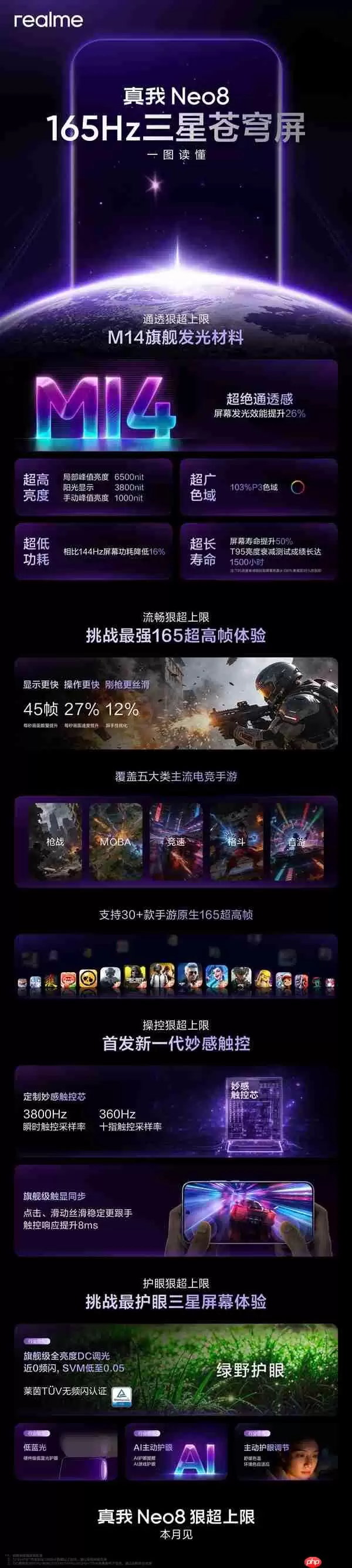 尤为值得一提的是,真我Neo8首发搭载了新一代妙感触控系统。它配备了专属触控芯片,支持高达3800Hz的瞬时触控采样率与360Hz的十指同步触控采样率。此外,realme还引入了全新的旗舰级触显同步技术,使得点击与滑动响应更为流畅精准,整体触控延迟降低了8ms,为竞技游戏玩家提供了硬件级的操控优势。
