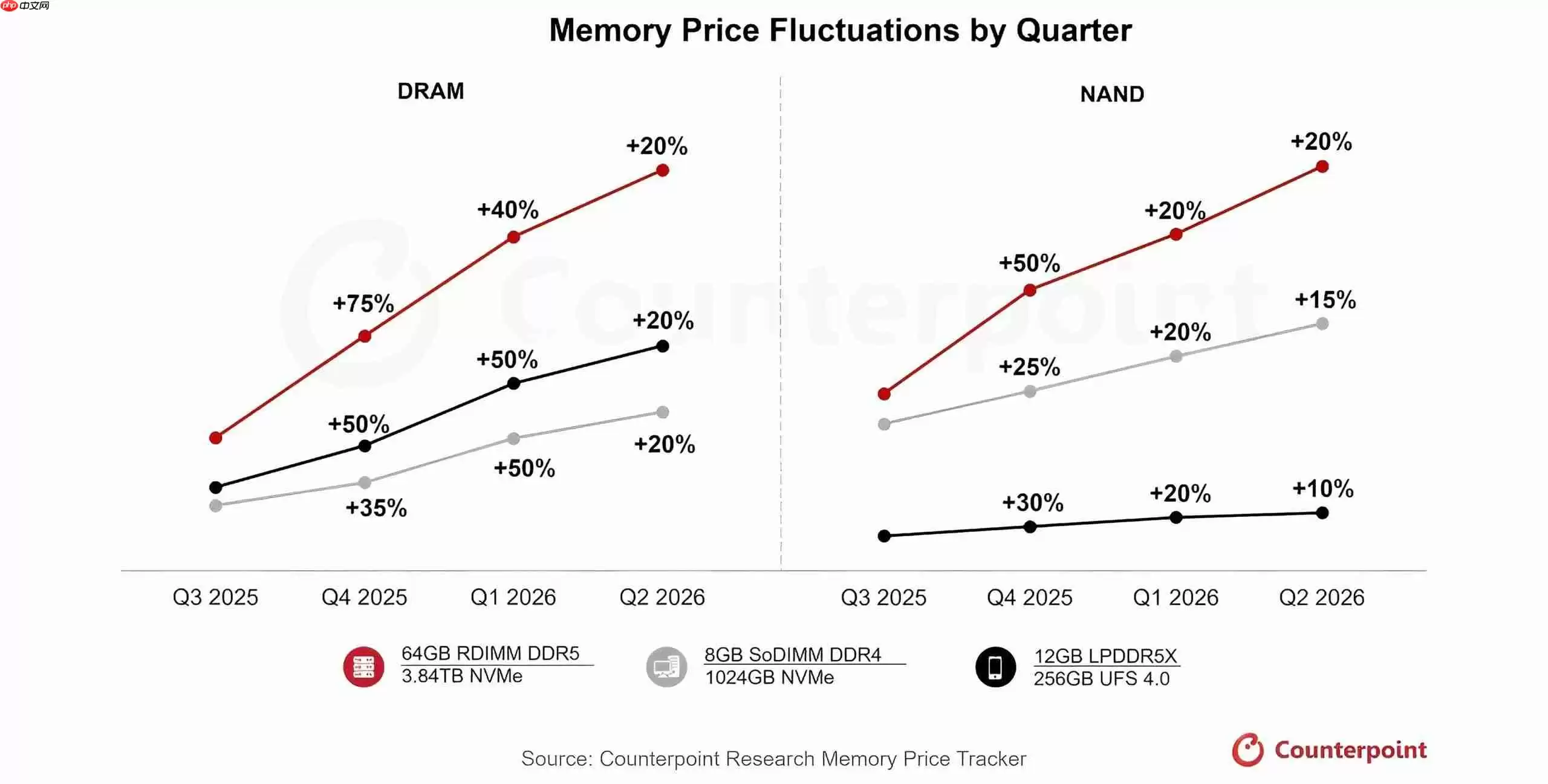 报告对价格走势给出了具体预测。2026年第一季度,存储芯片价格预计仍将上扬40%至50%。尽管进入第二季度后涨幅可能有所放缓,但依然有望维持约20%的高位增长势头。这表明,市场的核心驱动力依然强劲,短期内没有显示出疲软迹象。