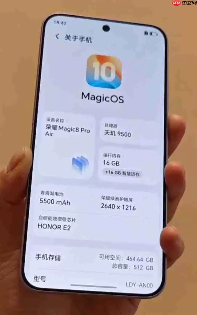 最新流出的图片进一步揭示了 HONOR Magic8 Pro Air 的强悍内“芯”。据悉,该机将搭载联发科旗舰级的天玑9500处理器,性能表现值得期待。同时,它将配备一块高规格屏幕,分辨率为2,640 × 1,216,能够带来细腻流畅的视觉体验。在内存与存储方面,这款手机将至少提供16GB运行内存(RAM)与512GB机身存储(ROM)的组合,充分满足用户对于多任务处理和大容量存储的需求。