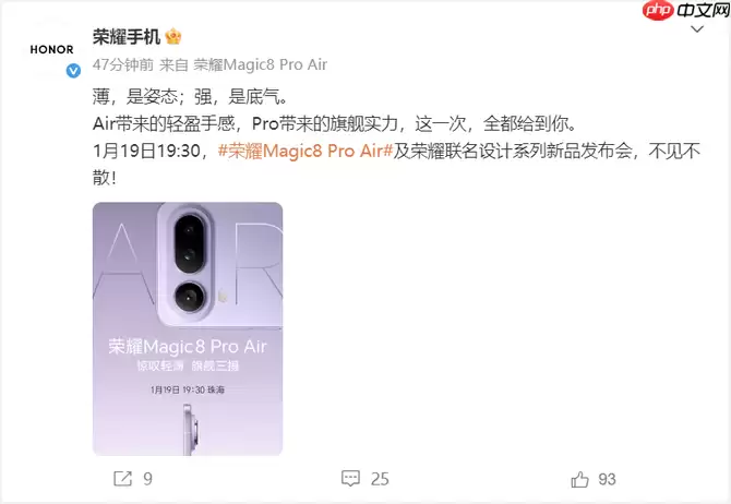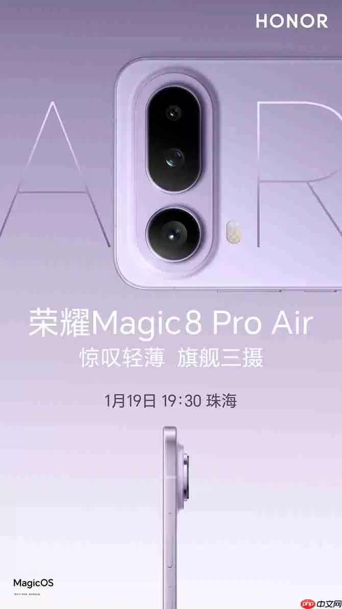 2026年1月12日,荣耀官方正式宣布,其全新双旗舰——荣耀Magic8 RSR保时捷设计版与荣耀Magic8 Pro Air,将于1月19日19:30在珠海隆重亮相。随着发布日期尘埃落定,两款机型的外观风格与关键配置也逐步浮出水面:前者承袭保时捷设计一贯的尊贵调性,以全维度旗舰规格诠释顶级工艺;后者则锚定轻薄旗舰新范式,正面硬刚苹果Air系列,力图重塑“轻薄≠性能妥协”的行业认知。