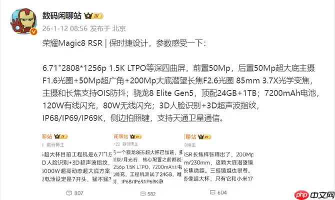 作为Magic系列中定位最高的衍生旗舰,荣耀Magic8 RSR保时捷设计版在硬件层面几乎拉满所有标杆。据知名数码博主@数码闲聊站 透露,该机配备一块6.71英寸、分辨率为2808×1256的1.5K LTPO等深四曲面屏;影像系统方面,前置为5000万像素自拍镜头,后置则由5000万像素超大底主摄、5000万像素超广角及2000万像素大底潜望式长焦组成三摄矩阵——其中主摄光圈达F1.6,潜望长焦支持F2.6光圈、85mm等效焦距与3.7倍光学变焦,且主摄与长焦均搭载OIS光学防抖技术。