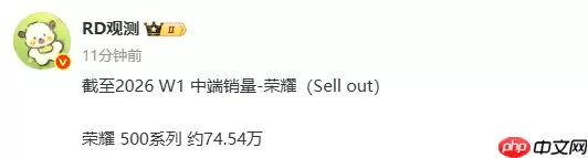 近日,国内智能手机市场传来一组引人关注的数据。据多位数码领域博主联合披露的信息显示,截至2026年第一周,荣耀500系列产品在国内中端智能手机市场的表现相当亮眼,其总出货量已成功突破74.54万台大关。这对于一个上市不久的产品线而言,无疑是一个值得肯定的市场成绩。