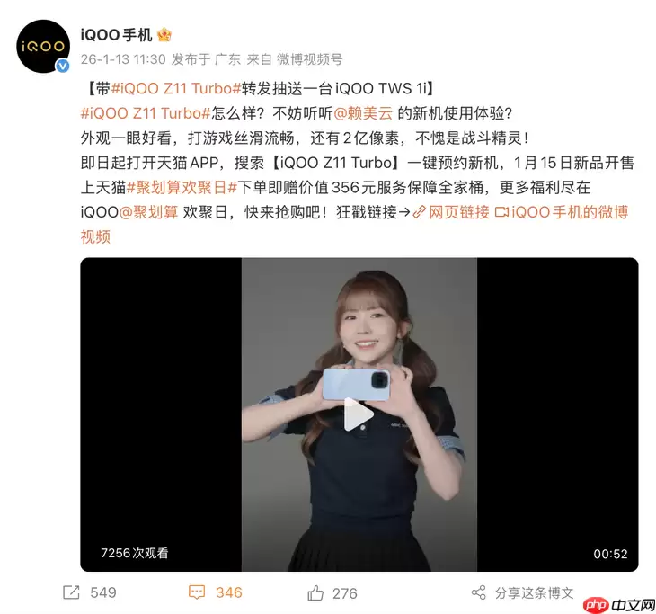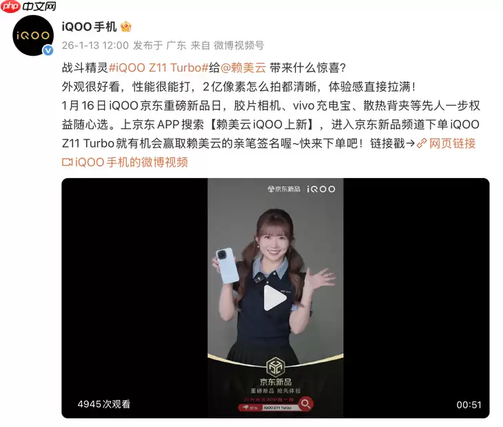 今晚(1月13日)19:00,iQOO Z11 Turbo新品体验官赖美云将准时亮相iQOO官方直播间,携手粉丝“云逛展”、深度探秘真机细节。即日起,打开天猫APP搜索【iQOO Z11 Turbo】,或登陆京东APP搜索【赖美云iQOO上新】,进入专属活动页,即有机会尊享购机无忧保障、限定新品周边及赖美云亲笔签名照等多重惊喜权益。
