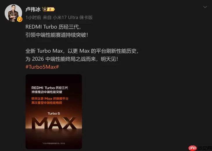 小米集团合伙人、总裁卢伟冰此前已在社交平台表达了对这款新机的十足信心。他直言,Redmi Turbo 5 Max有望成为2026年2500元价位段的“闭眼入”首选,开局即封神,首秀即终局。这番表态无疑将市场的期待值拉满。