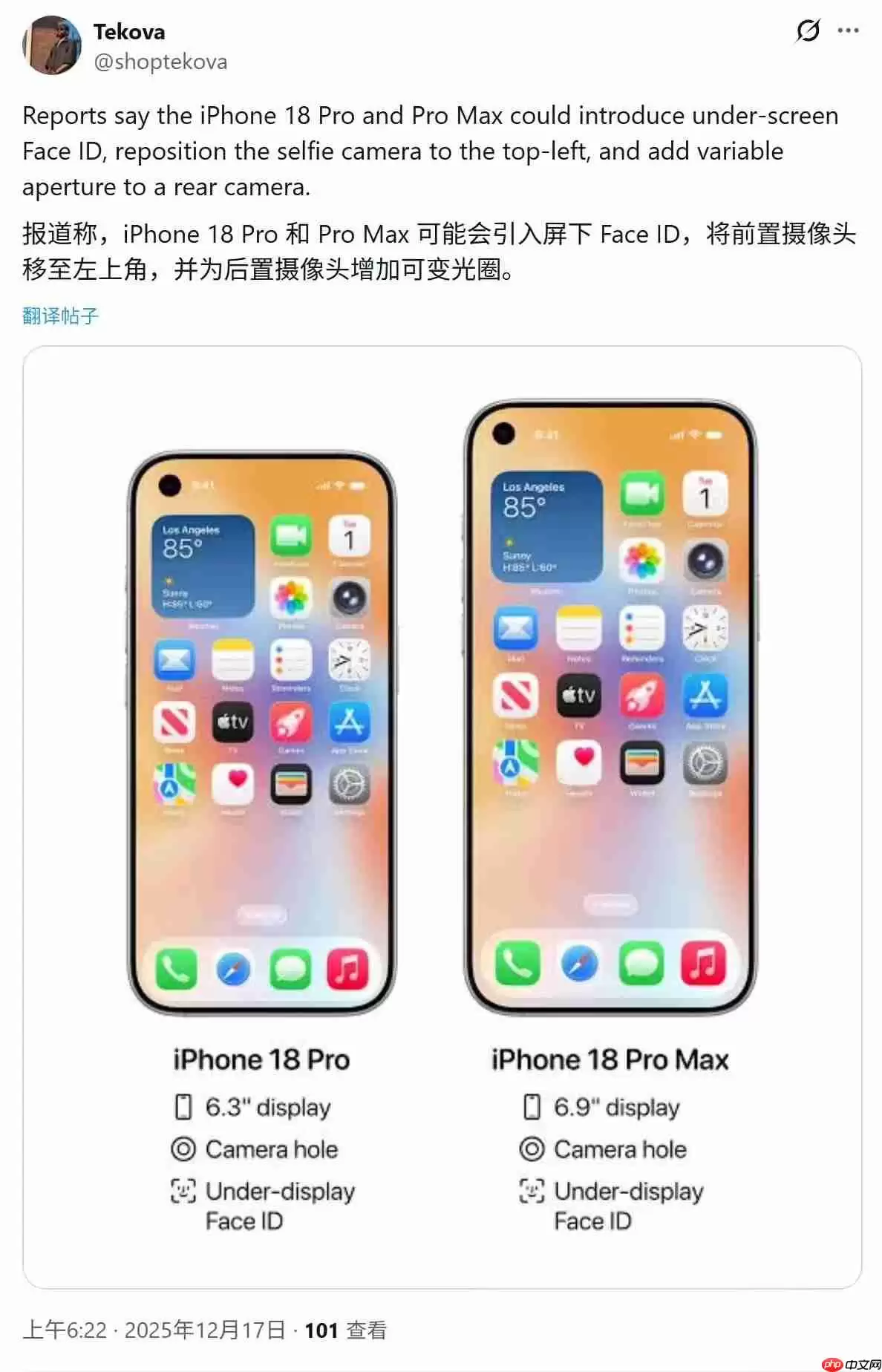 尤为引人关注的是,iPhone 18 Pro与Pro Max将全面取消现有的“灵动岛”药丸状挖孔形态,转而采用左上角单孔式前置摄像头布局。同时,苹果将同步实现部分Face ID传感器的屏下隐藏。