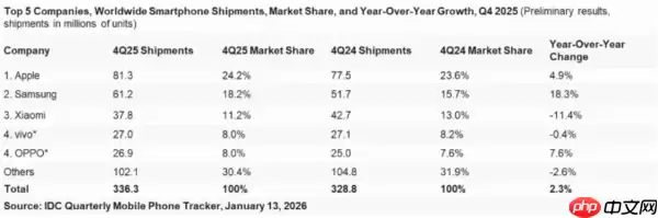 数据显示,2025年第四季度全球智能手机出货量为3.363亿台,同比增长2.3%。尽管该季度仍面临存储芯片供应紧张的局面,但增长势头得到了多方面因素的支撑。