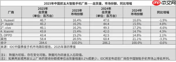 相比之下,多数二线厂商在2025年面临更明显的压力。小米、vivo与OPPO虽然整体维持了原有的竞争格局,但市场份额略有收窄。