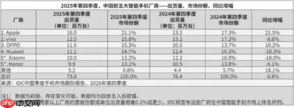 聚焦到区域市场,2025年第四季度,中国智能手机市场出货量约为7578万台,同比微降0.8%。