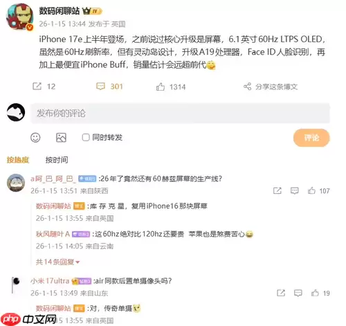 作为苹果布局中端市场的战略产品,iPhone 17e的显示方案自然备受关注。据悉,该机将配备一块6.1英寸的LTPS OLED面板,刷新率维持在60Hz。对此,部分网友提出疑问:“到了2026年,还会有60Hz的产品线吗?”该博主直接回应称,这是为了“清库存利器,用的是iPhone 16那块屏”,证实了其屏幕将采用前代剩余物料进行再利用。这一策略在有效控制成本的同时,也加速了供应链的库存周转。